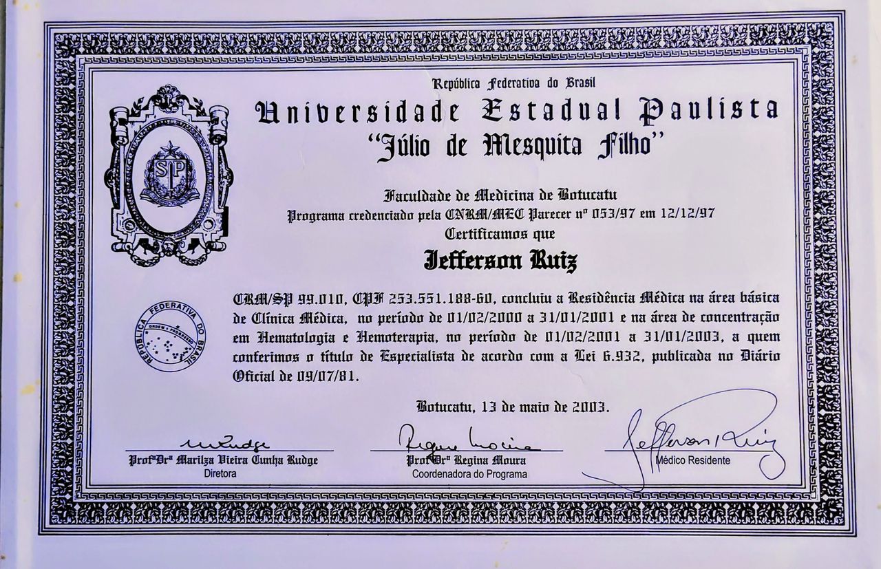 São 22 anos de Formação em Hematologia e Hemoterapia, e 21 em Transplante de Medula Óssea.
